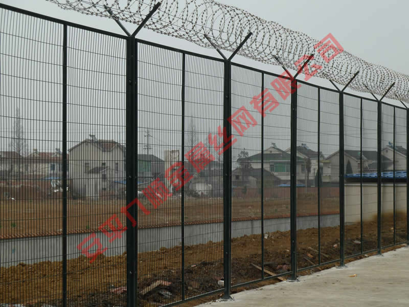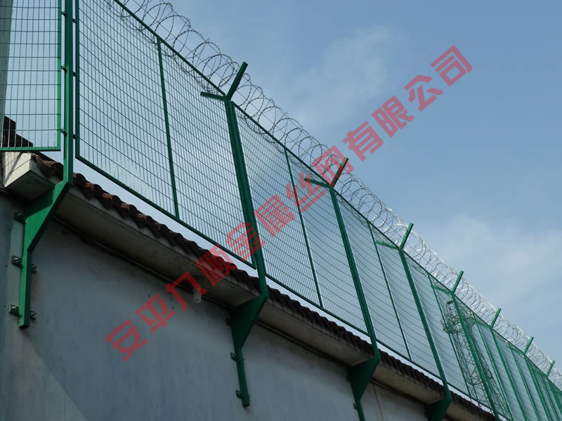 監獄防護網立柱一般焊接成Y型,是為了方便在上邊加一道防護刺網,種種刺網的刀片非常鋒利,即使犯罪分子爬到護欄網上邊也是無法翻越的,只要觸摸到就會被刺傷,防護性能是非常高的,一般客戶都會要求加上的,價格上邊不會有太大差距。