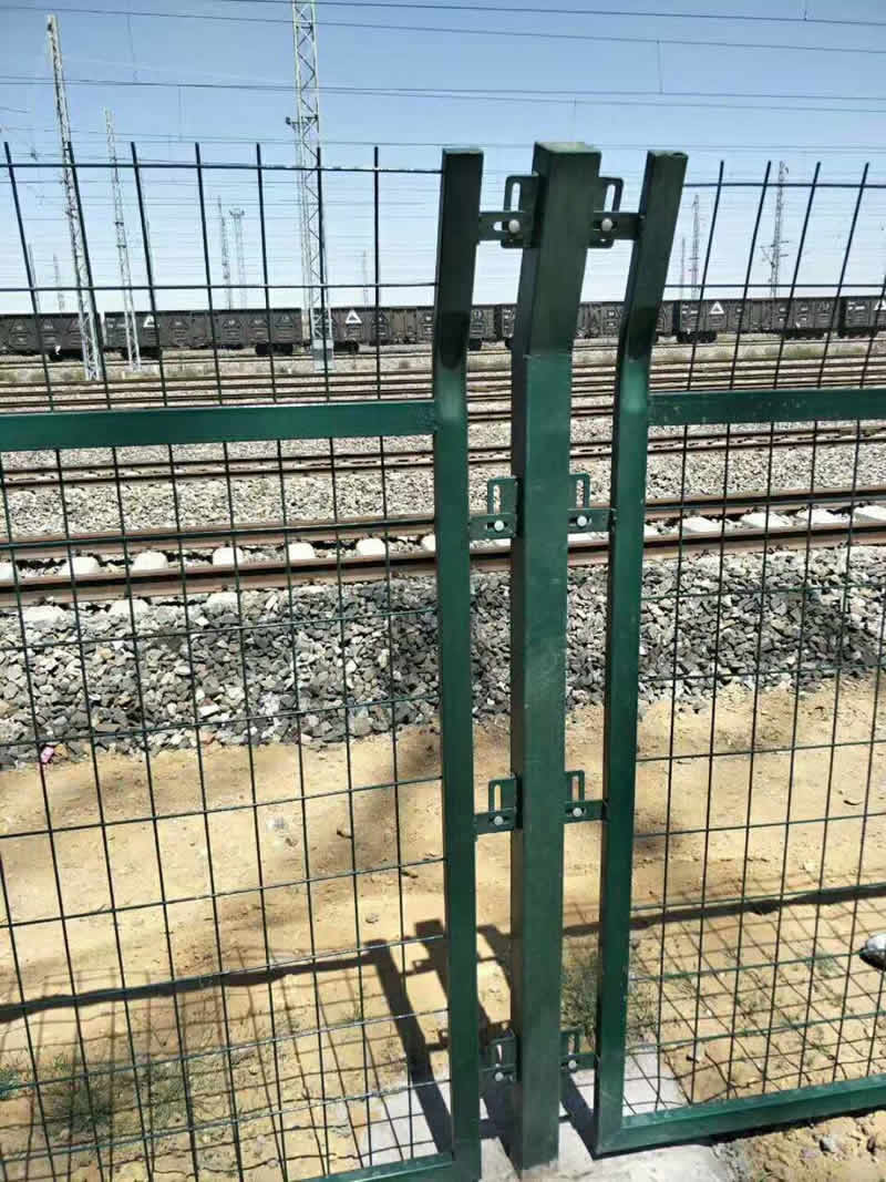 鋼筋混凝土立柱金屬網(wǎng)片防護柵欄可采用單開門或雙開門兩種形式。單開寬度1.5m,雙開寬度3m,其網(wǎng)片形式與防護柵欄保持一致,并通過銷鈾、銷鈾套與立柱連接。