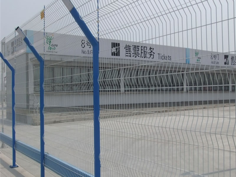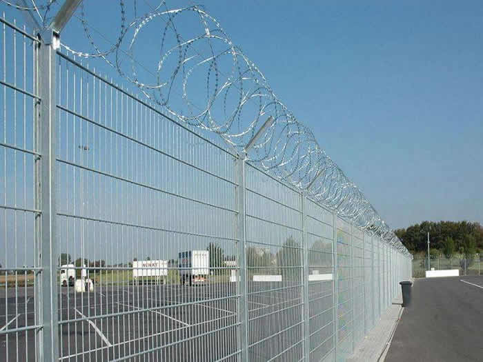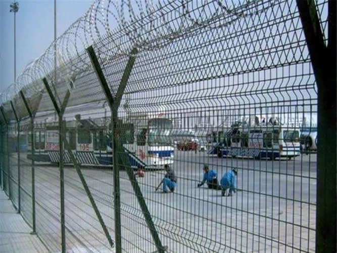 網片中帶有V型加強筋,可大大增強圍網的抗沖擊力。立柱為60×60的矩形鋼,頂端焊有V型支架,或者采用70×100mm的掛式連接立柱。以上產品均為熱鍍鋅后采用高質量的聚酯粉末經典噴涂,采用國際流行的RAL顏色,在雙層的優質防腐處理后,可達十年的超長壽命。圍網頂部加上熱鍍鋅刀片刺絲(BTO)后又很好的增加了安全防護性能,也更具美觀性,中國首都機場等大型機場已廣泛使用此種產品,并得到極大認可。